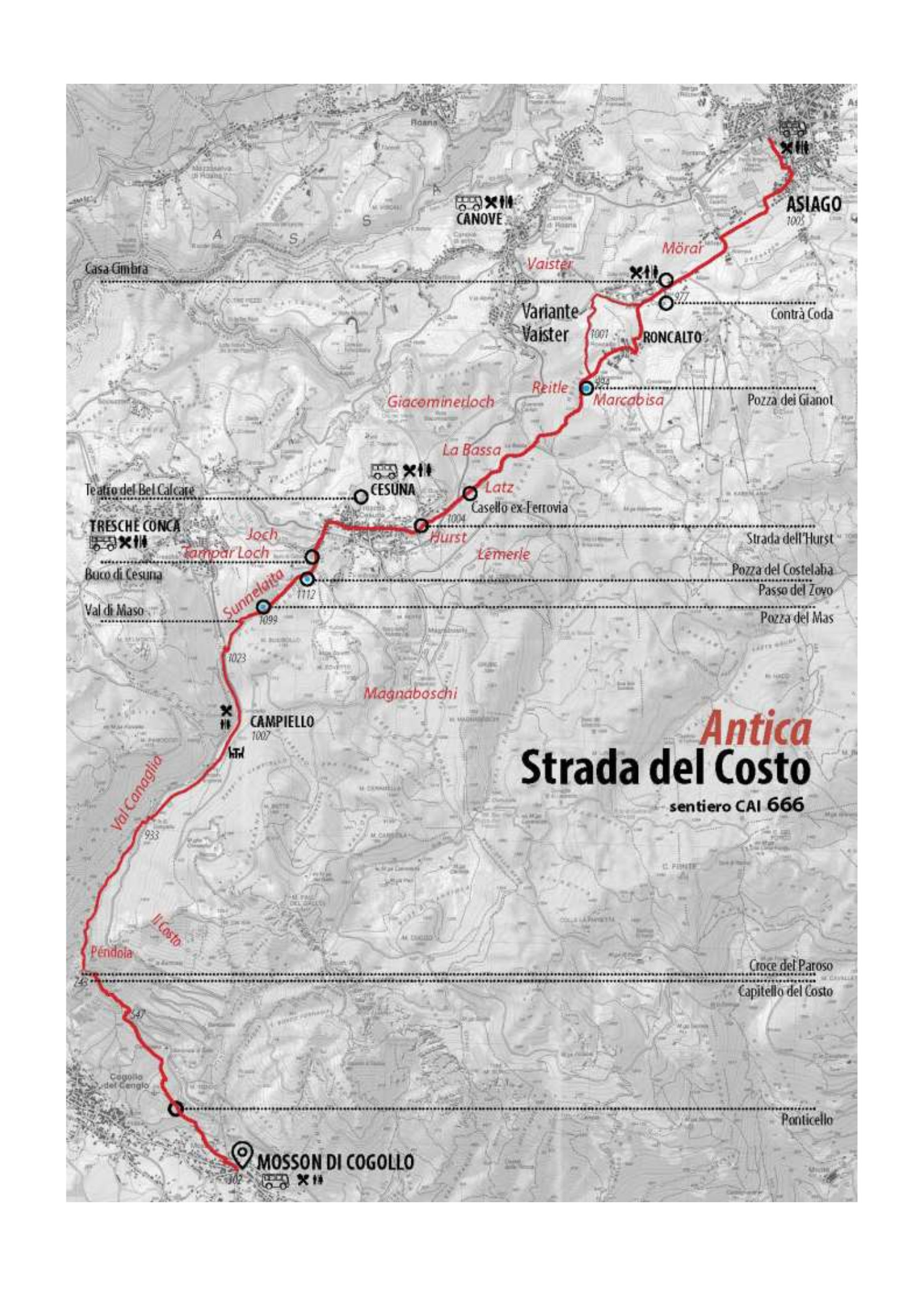 L’itinerario parte da Mosson, nel Comune di Cogollo del Cengio, e arriva ad Asiago: un tragitto di oltre 16 chilometri usato per secoli come via di collegamento tra la pianura vicentina e l’Altopiano dei Sette Comuni. È l’antica strada del Costo, un grande patrimonio storico a lungo dimenticato, che di recente è stato ripristinato con il contributo dei volontari dell’Associazione Montagne e Solidarietà. Un’opera che ha richiesto un anno e mezzo di lavoro e migliaia di ore per liberare la strada dalla vegetazione, riportandone in luce il sedime. I lavori comprendevano anche la sistemazione delle massicciate e dei muretti e la pulizia delle principali pozze lungo il percorso, un tempo a servizio della transumanza.