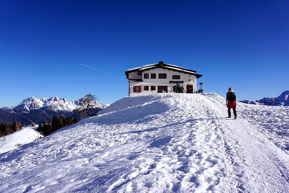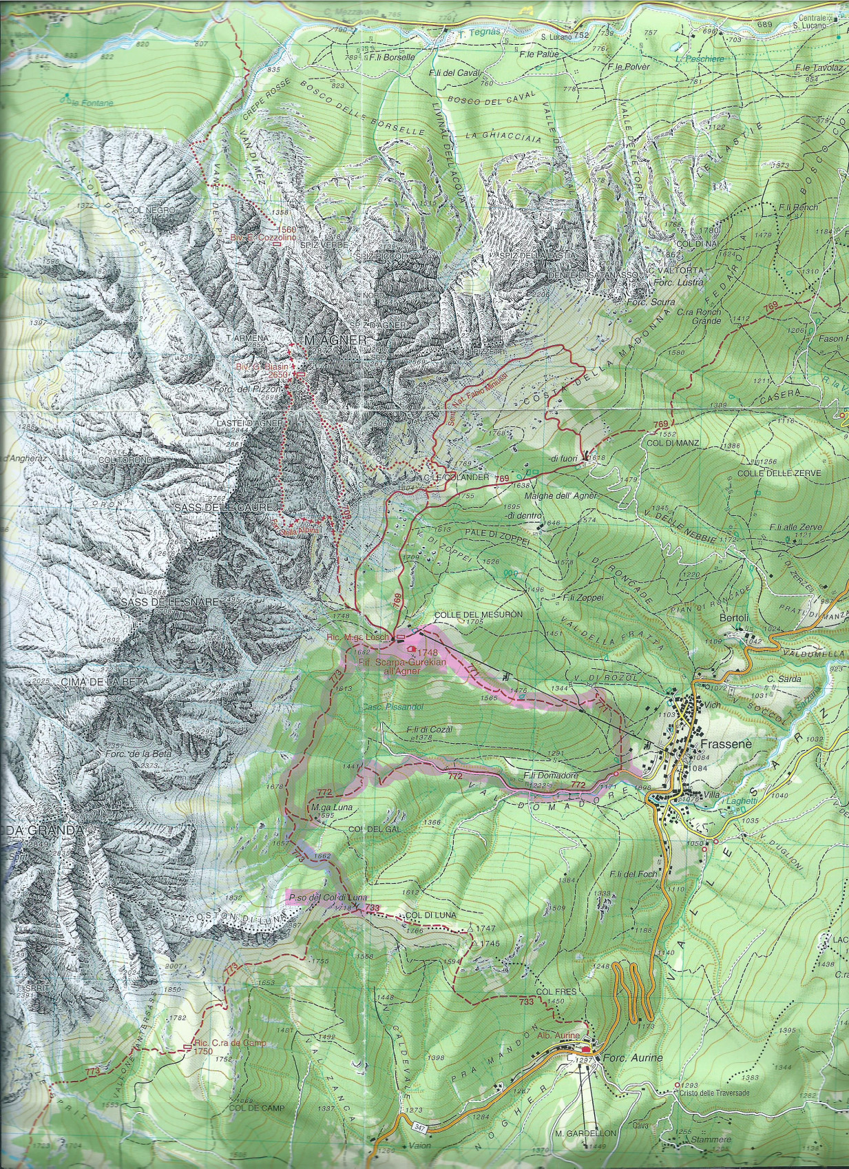 Descrizione itinerario: Dalla piazza del paese di Frassenè prendiamo la strada asfaltata che sale tra le case alte del paese. Al primo incrocio, dopo un centinaio di metri, prendiamo la stradina che parte strettissima sulla sinistra tra vecchie case e che passa sotto i fili della dismessa seggiovia. Dopo un chilometro troviamo un bivio con l’inizio degli itinerari. Ci dirigiamo a sx inoltrandoci nella Val Domadore sent. 772. Proseguendo arriviamo in vista della Malga Luna alt 1595. Da qui, con poco dislivello, la possibilità si salire al Passo Col di luna alt.1718 e alla cima. Ridiscesi alla Malga proseguiremo per la nostra meta, Rif. Scarpa alt.1735. Al rifugio sosta per pranzo. Chiuderemo il nostro giro ad anello scendendo per il comodo sentiero 771 che ci riporterà alle nostre auto.