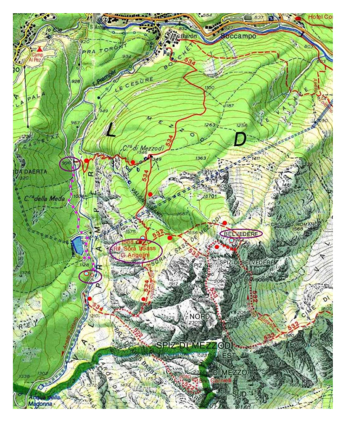 Dopo la pausa ristoratrice la comitiva A prosegue verso est con il sentiero CAI 532 risalendo in direzione Spitz di Belvedere. Al bivio è lasciata la possibilità di scegliere a DX un sentiero brevemente attrezzato nella parte finale, o a SX il sentiero normale che solitamente