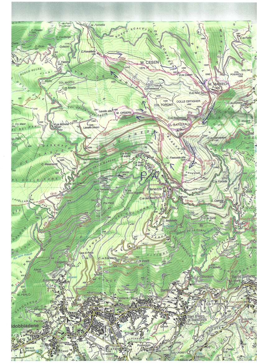 [/vc_column_text][vc_single_image image=”2300″ img_size=”full” alignment=”center” css_animation=”bounceIn”][/vc_column_inner][/vc_row_inner][/vc_column][/vc_row][vc_row][vc_column][vc_column_text]Il massiccio del monte Cesen è un massiccio delle Prealpi venete, situato al margine nord ovest della provincia di Treviso. Dal punto di vista geologico è costituito da rocce calcaree e dolomitiche di età mesozoica, soprattutto di biancone. Il percorso si snoda sulle pendici del Monte Orsere e Cesen tra la Prese e Barbaria, su pendii prativi soleggiati dal fondo sassoso dove per secoli la fienagione è stata la principale attività. Il fieno, tagliato ovviamente a mano, veniva trasportato a valle con le “musse” (apposite slitte) percorrendo appunto le “Strade delle musse”, sentieri selciati in forte discesa che permettevano di far scivolare l’antico mezzo di trasporto guidato e frenato da un uomo
