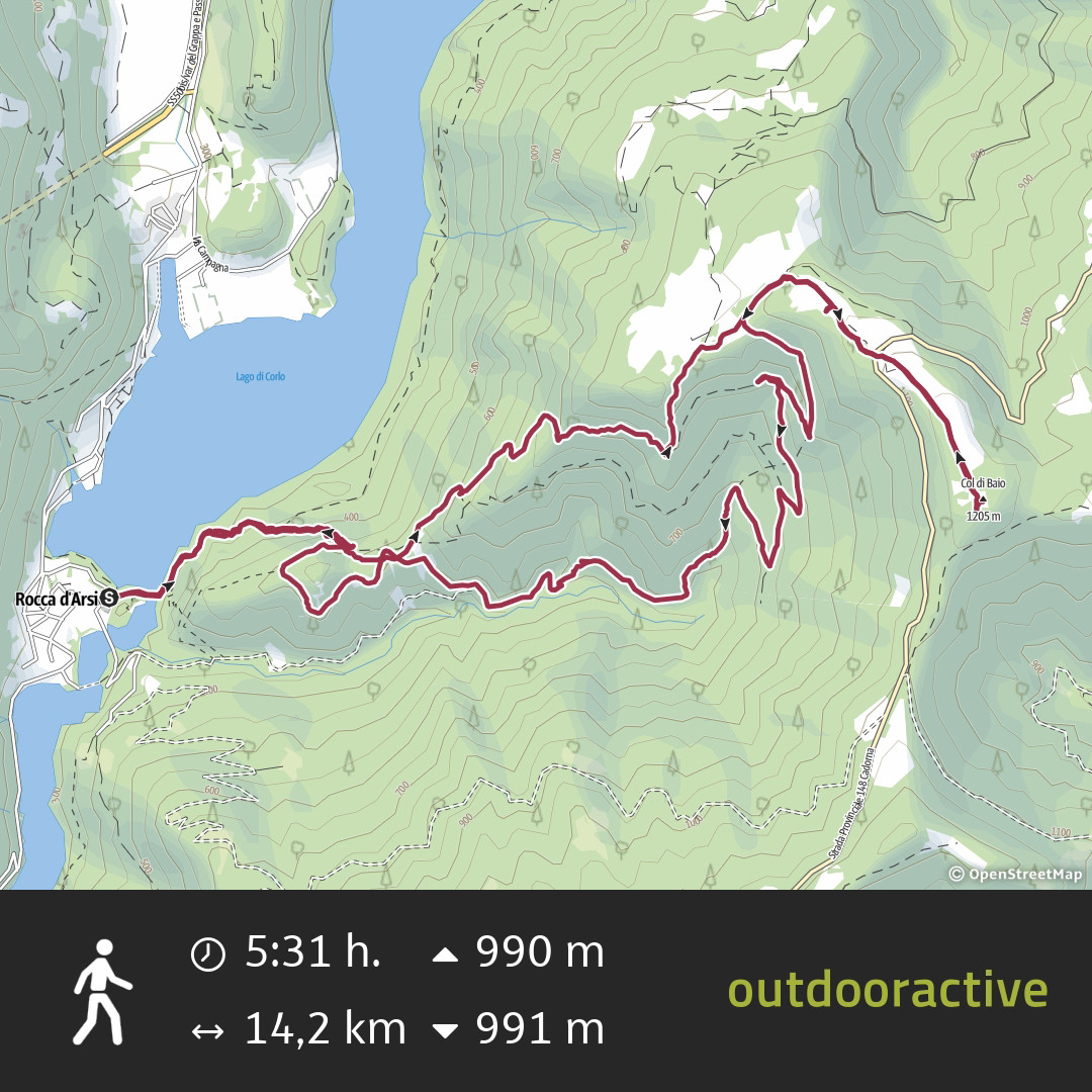 Il percorso si svolge tra carrarecce e sentieri delle pendici del Monte Grappa, partendo da Rocca di Arsiè sul Lago del Corlo seguendo il Sentiero CAI 807 e scendendo poi per strade forestali e sentieri di sottobosco.